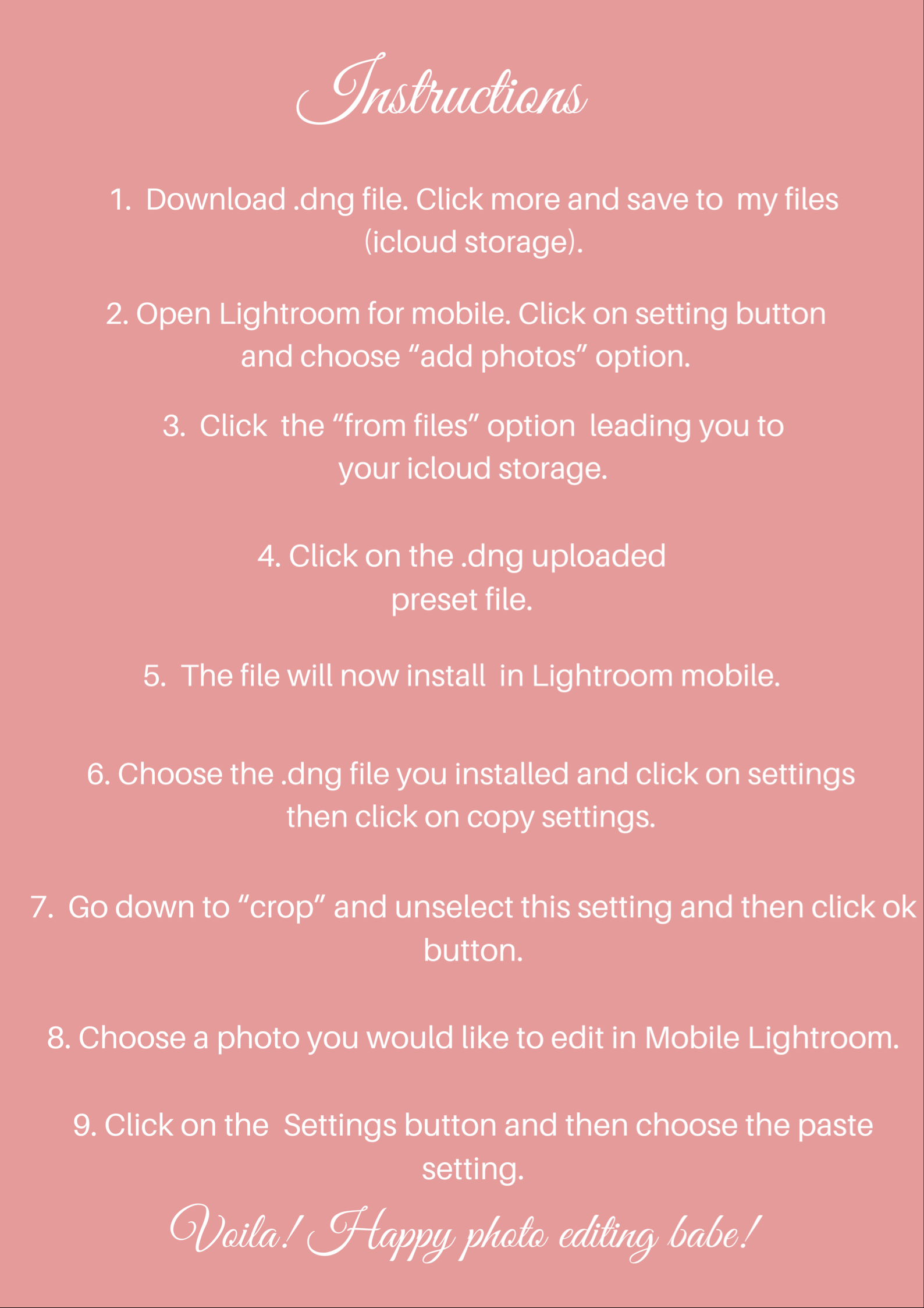 Please Note that the preset is made for Lightroom Mobile and must be installed on your Lightroom Mobile App.